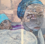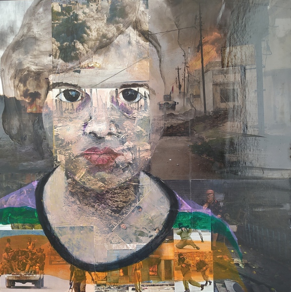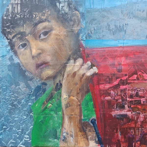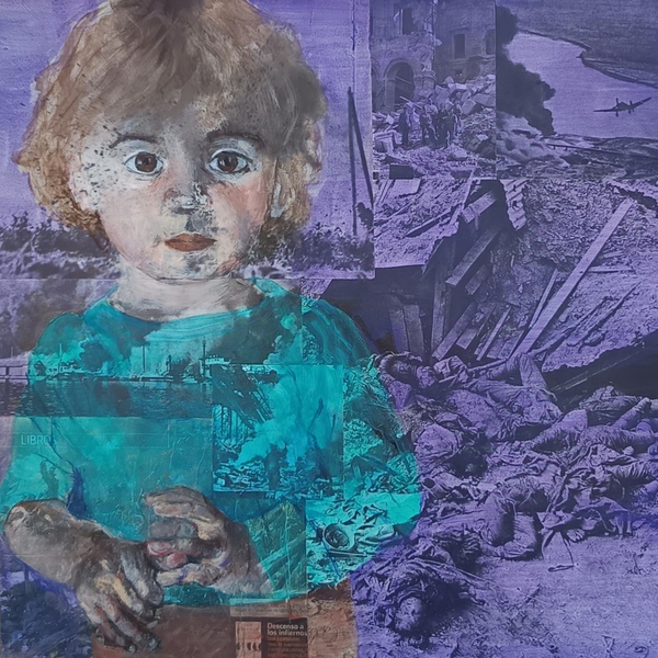 A primera vista, parecen ser simples retratos de menores mirando al espectador, pero al fijarse bien uno se dará cuenta de que esos retratos están pintados, con mucha transparencia, sobre una base de collage. Los collages están formados por imágenes de conflictos de guerra, históricos y actuales, de diferentes regiones, en diferentes continentes y entremezclados. No quiero resaltar un conflicto en concreto, sino denunciar la crueldad del ¨fenómeno¨ en su conjunto. Igualmente los retratos están inspirados en imágenes de prensa relacionados con conflictos de guerra en todo el mundo, porque hay victimas en todos los bandos.